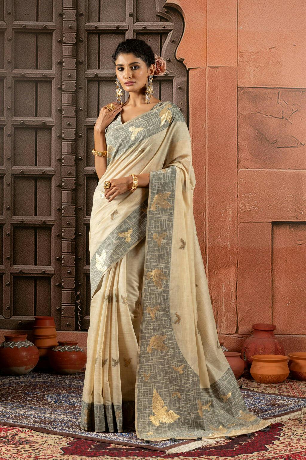 Iravya is wild in the most graceful way. The beige cotton body is calm and breathable, while the border features a stunning jungle tale — elephants, deers, and nature motifs in earthy tones. It’s a piece that makes conversations wherever it goes.