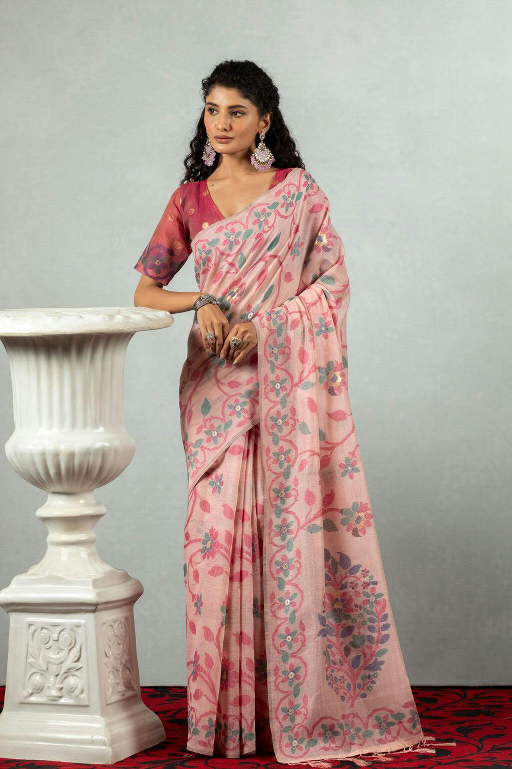 Kesarika is that rare piece that combines tradition with playfulness. Its earthy cotton body is paired with a vibrant multicolor jaal border, designed to add just the right amount of liveliness. The Kashmiri-style detailing flows across the pallu like a story — rooted in craft, rich in colour. Whether you’re hosting or attending, this saree makes you feel dressed up without feeling dressed loud.